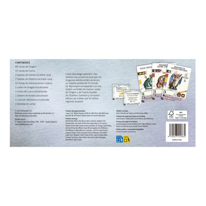 Bienvenido a Wyrmspan: Academia de Dragones, un emocionante juego de mesa donde te convertirás en un dracólogo aprendiz decidido a liberar el máximo potencial de los dragones adolescentes. Esta expansión te ofrece una amplia variedad de cartas de Dragón y Cueva, losetas de Objetivo, Gremios y un nuevo tablero de rondas que te proporciona ingresos al pasar. ¡Es hora de demostrar tus habilidades!